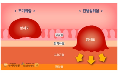 위암은 우리나라 암 발생률 부동의 1위이며 사망률은 2위를 차지할 만큼 치명적인 질환입니다. 위암은 두 가지 형태로 침윤하게 되는데 점막이나 점막하층을 따라 넓게 펴지는 경우가 있고 장막층을 향해 깊숙이 퍼질 수 있어요.